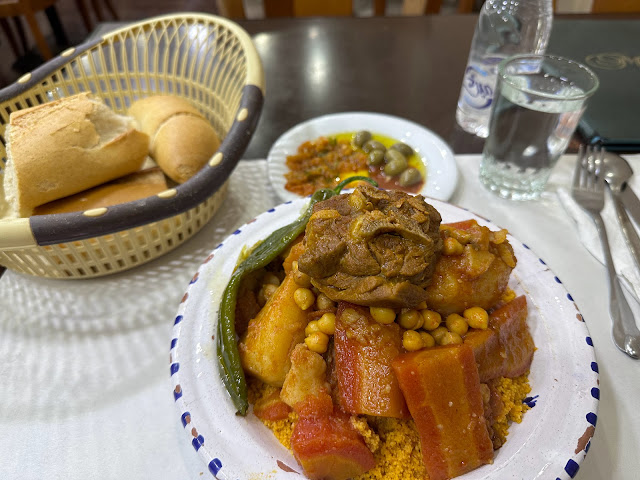 The dish comes with couscous, also condiments which can be harissa and aubergine paste and olives and a small green salad
